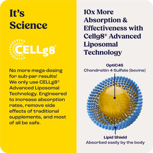 No more mega-dosing for sub-par results! We only use CELLg8® Advanced Liposomal Technology – scientifically proven to absorb up to 10X more.