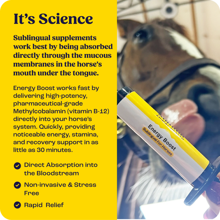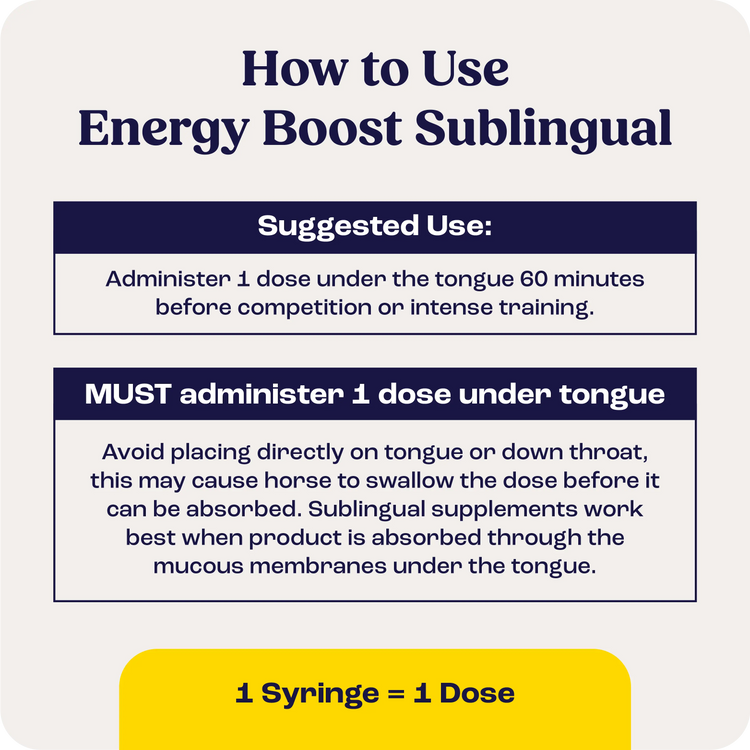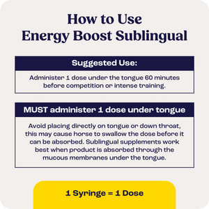 Avoid placing directly on tongue or down throat, this may cause horse to swallow the dose before it can be absorbed. Sublingual supplements work best when product is absorbed through the mucous membranes under the tongue.