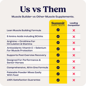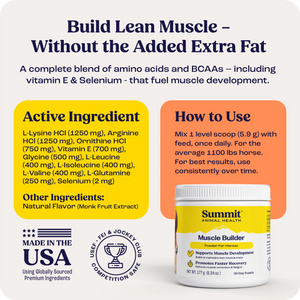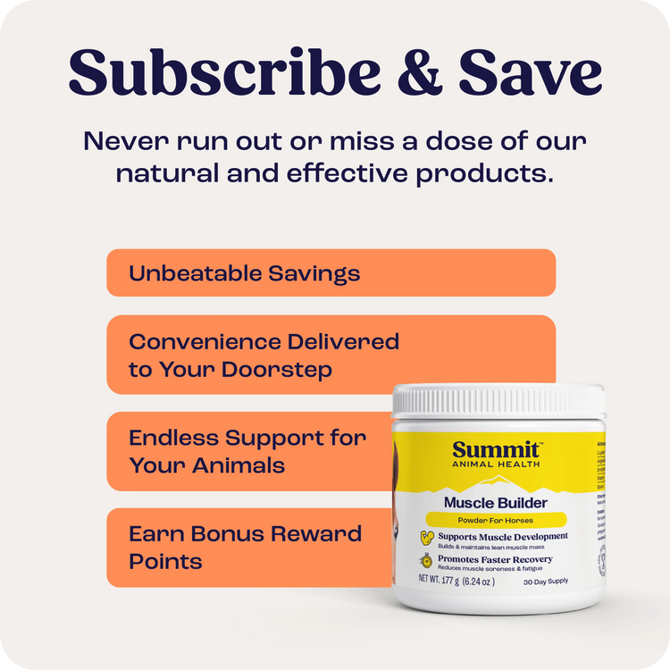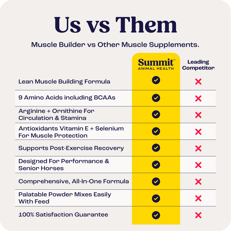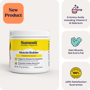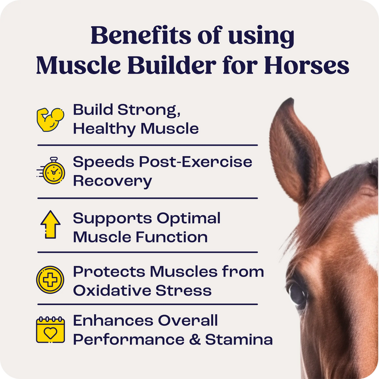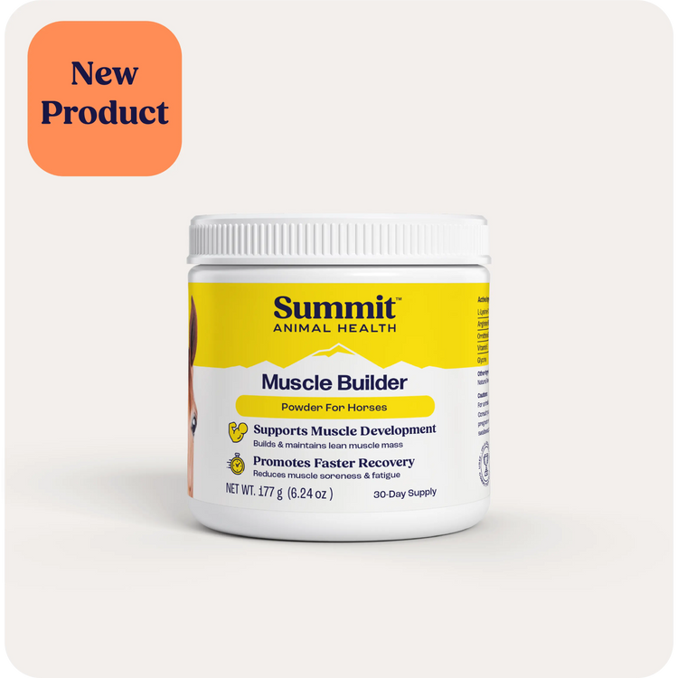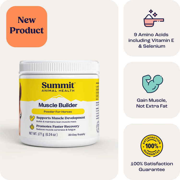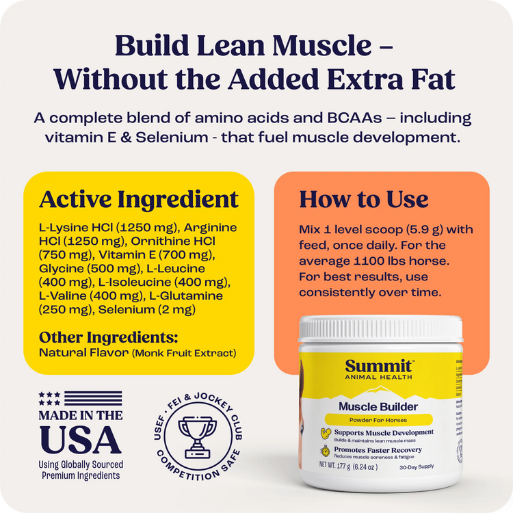 Build lean muscle, support strength, and promote healthy recovery with a specially formulated blend of essential amino acids and antioxidants. Muscle Builder helps horses maintain topline, stay strong through training cycles, and recover comfortably after work – without adding unwanted bulk or calories. Ideal for horses in training, competition, or rebuilding strength.