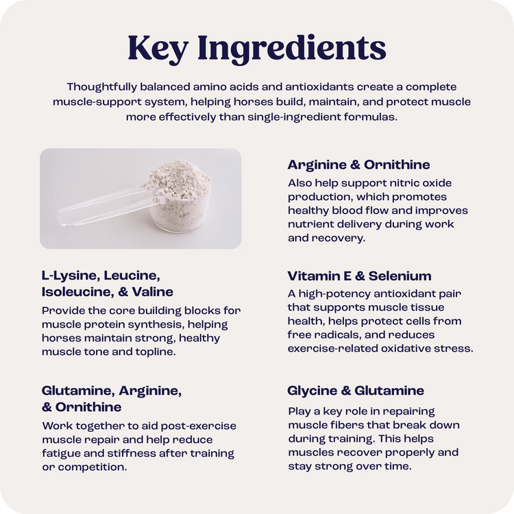 Thoughtfully balanced amino acids and antioxidants create a complete muscle-support system, helping horses build, maintain, and protect muscle more effectively than single-ingredient formulas.