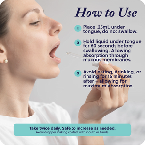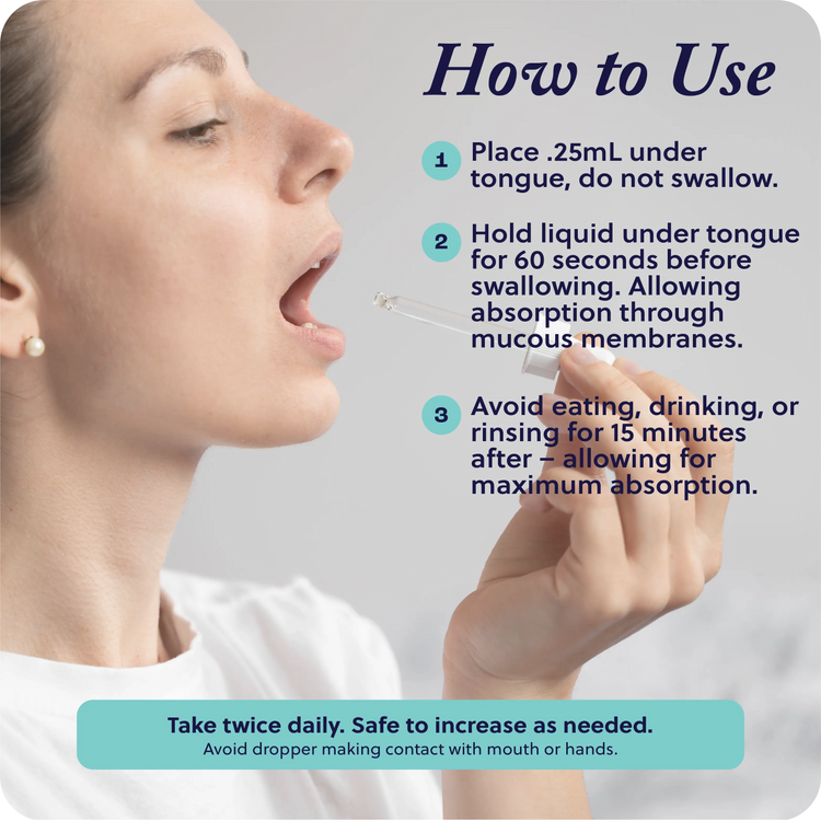 Take twice daily, safe to increase as needed. Place .25mL under tongue and hold for 60 seconds before swallowing – allowing absorption through mucous membranes.