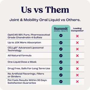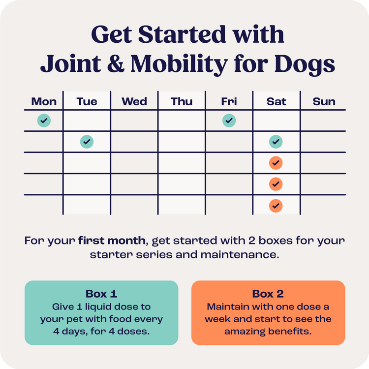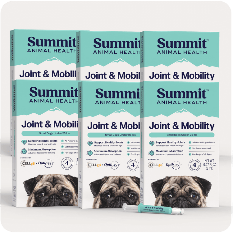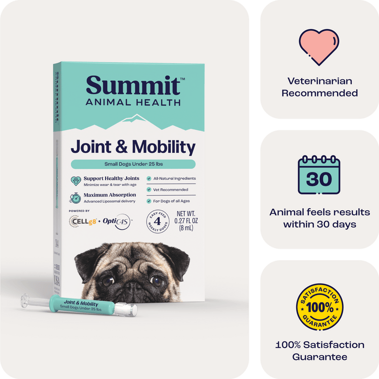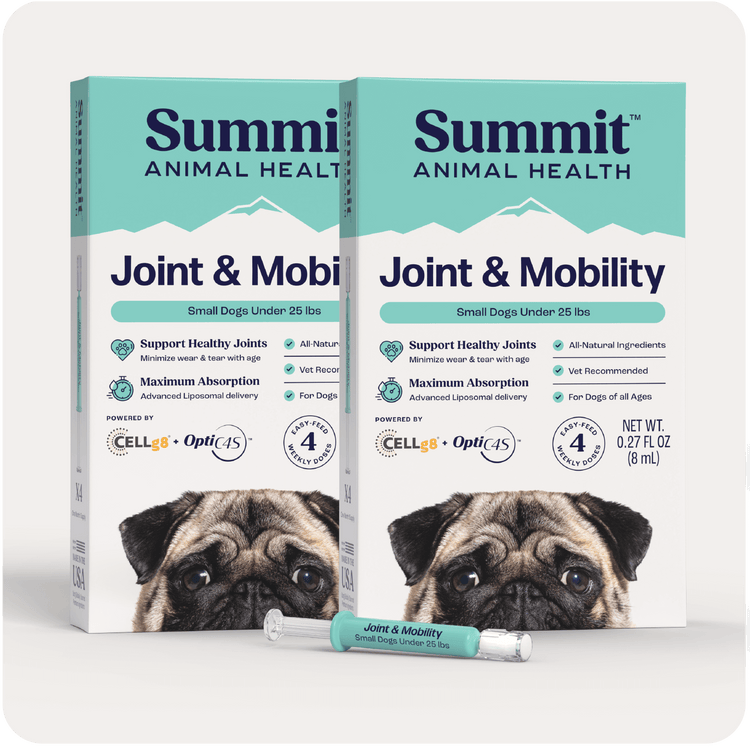 Less vet visits, more trips to the park! Target joint discomfort, inflammation, and the effects of aging with our revolutionary liquid formula. Maximize your dog’s comfort and enhance their mobility with our powerful, rapid-relief weekly supplement. See the difference within 30 days and help your pup live their best life. Designed specifically for dogs under 25 lbs.