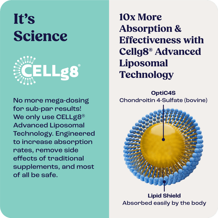 No more mega-dosing for sub-par results! We only use CELLg8® Advanced Liposomal Technology – scientifically proven to absorb up to 10X more.